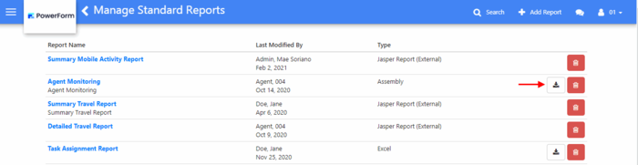 The download button in the Manage Standard Reports allows users to download a copy of the uploaded report file. Downloaded report files can be modified and uploaded back to the system.