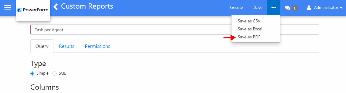 Click on the Title of the report to open it, then click the More button and select Save as PDF.