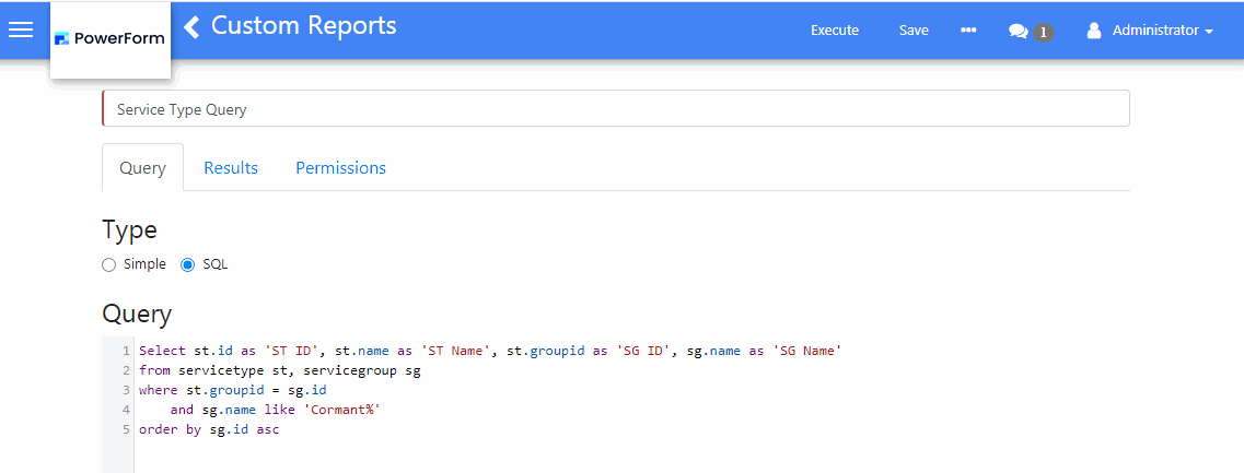 3. The Custom Reports screen will be displayed showing the Query tab of the record.