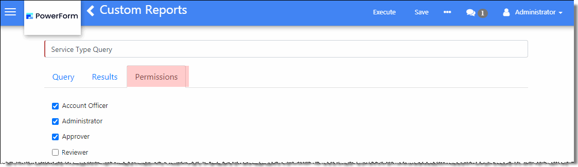 8. Next, set the permission to the report. Click the Permissions tab. Mark the Roles that will have access to the report.